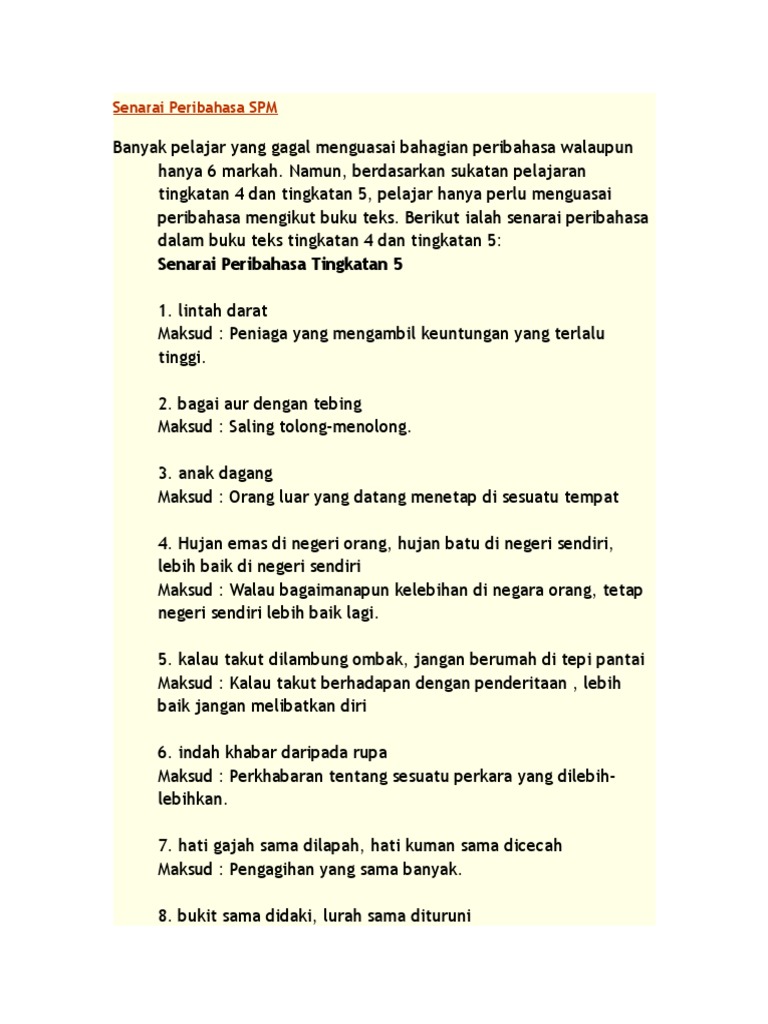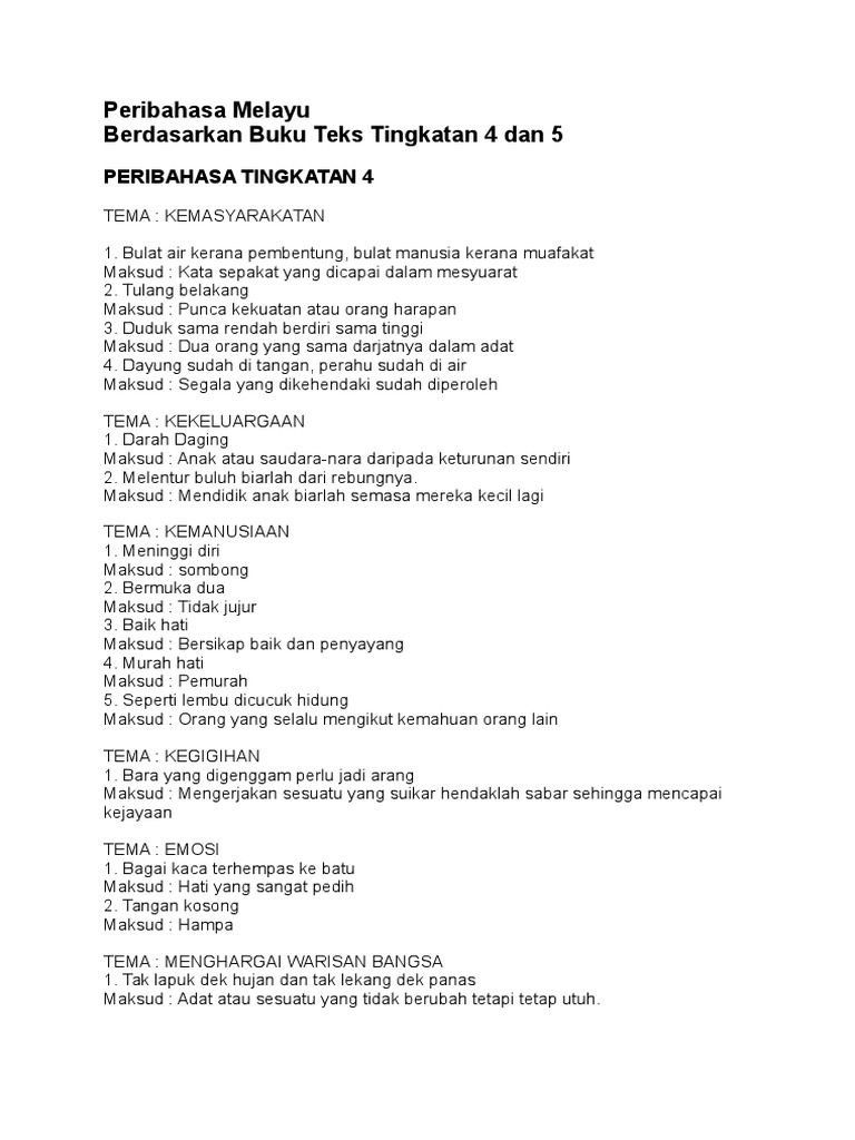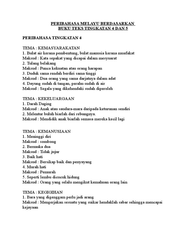 Koleksi peribahasa tingkatan 4 dan 5 vs soalan tahun lepas. Hasil diatas adalah hasil pencarian dari anda peribahasa bahasa melayu tingkatan 5 mp3 dan menurut kami yang paling cocok adalah. Nota sejarah ini sebenarnya sesuai untuk dijadikan panduan kepada murid tingkatan 4 dan 5 bagi menghadapi peperiksaan. Bulat air kerana pembetung, bulat manusia kerana muafakat. Anak dan saudara dari keturunan sendiri.